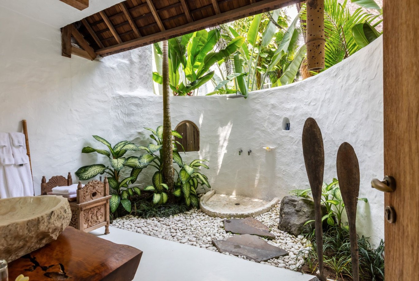 Semakin mempertegas desain kamar mandi konsep ini, memanfaatkan bambu menjadi dinding shower box dan lapisan luar saluran untuk air shower.