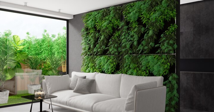 Menciptakan focal point di ruang keluarga dengan taman vertikal menjadi ide yang menarik untuk menambah estetika ruang.