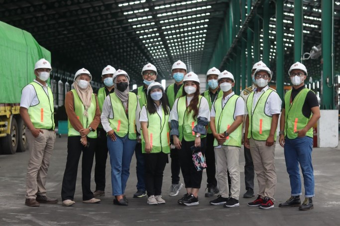 Selanjutnya sesuai SOP yang berlaku, sebelum masuk ke area pabrik para tamu diberikan helm dan rompi safety agar tetap terlindungi selama berada di area pabrik baja ringan.